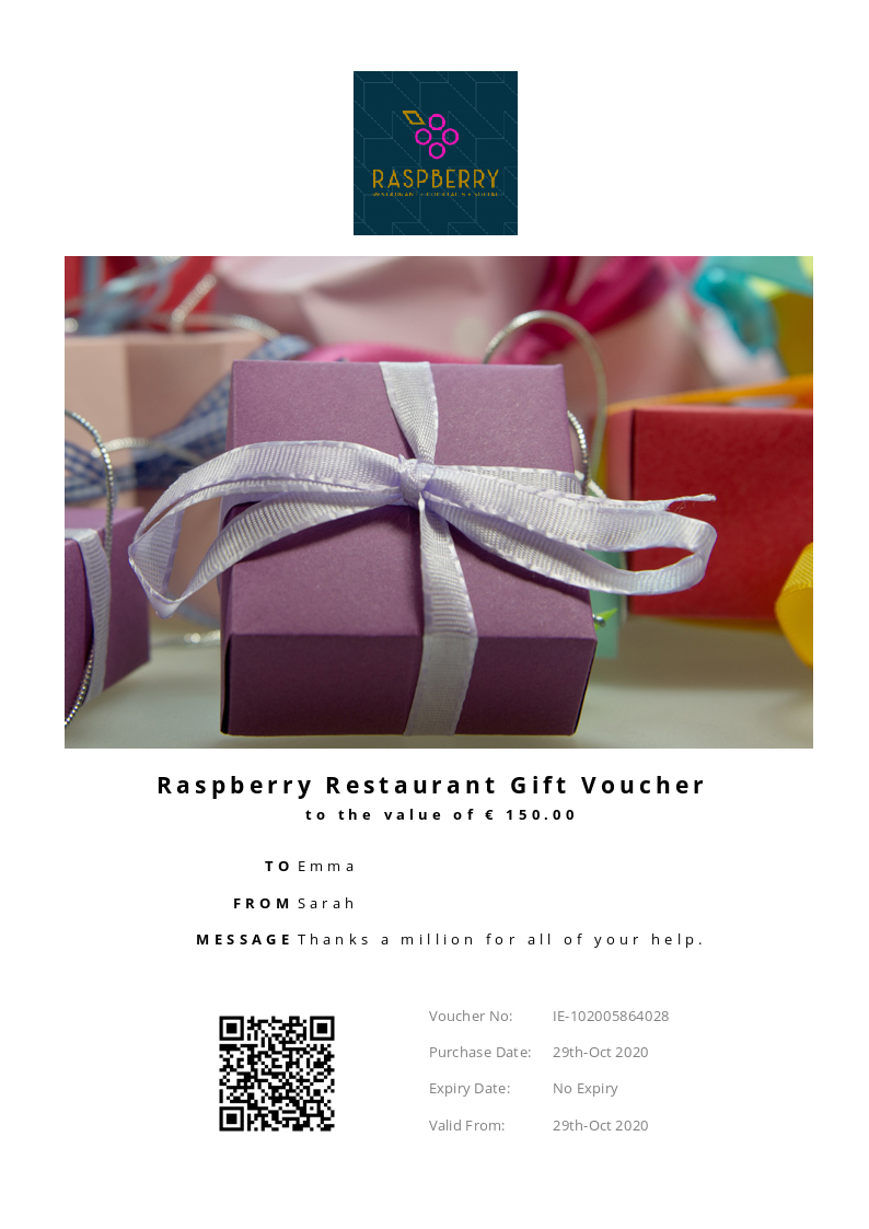 Raspberry Restaurant allows you to purchase instantly printable gift vouchers, special offers and tickets using the Voucher Connect platform.